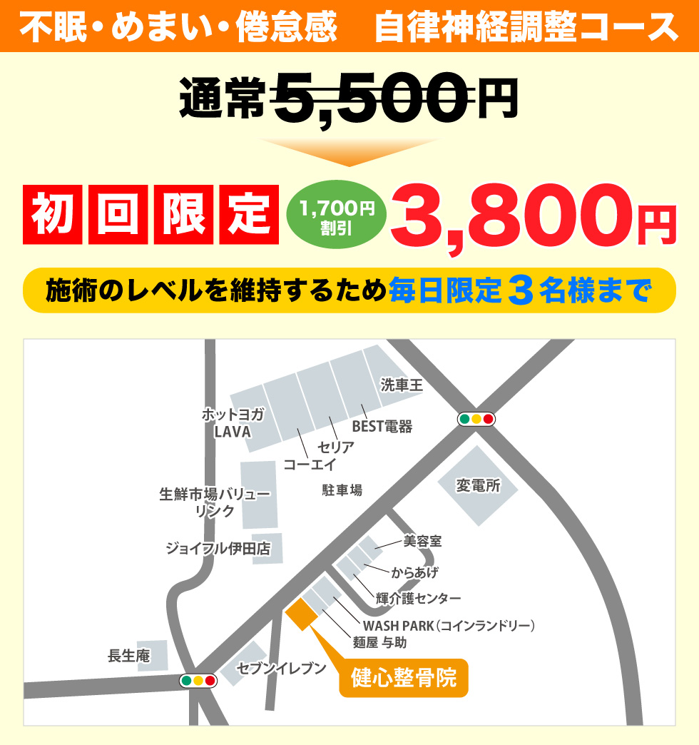 健心整骨院では、自律神経の乱れに起因する不調(いわゆる自律神経失調による不定愁訴)に対して、